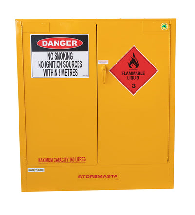 SC160The 160L Flammable Liquid Storage Cabinet is an indoor safety cabinet storing up to 160 litres of Class 3 Flammable Liquids. Features include perforated shelving for air flow, flash arrestors and vent openings for mechanical ventillation systems and a 57L liquid tight sump to contain leaks and spills.